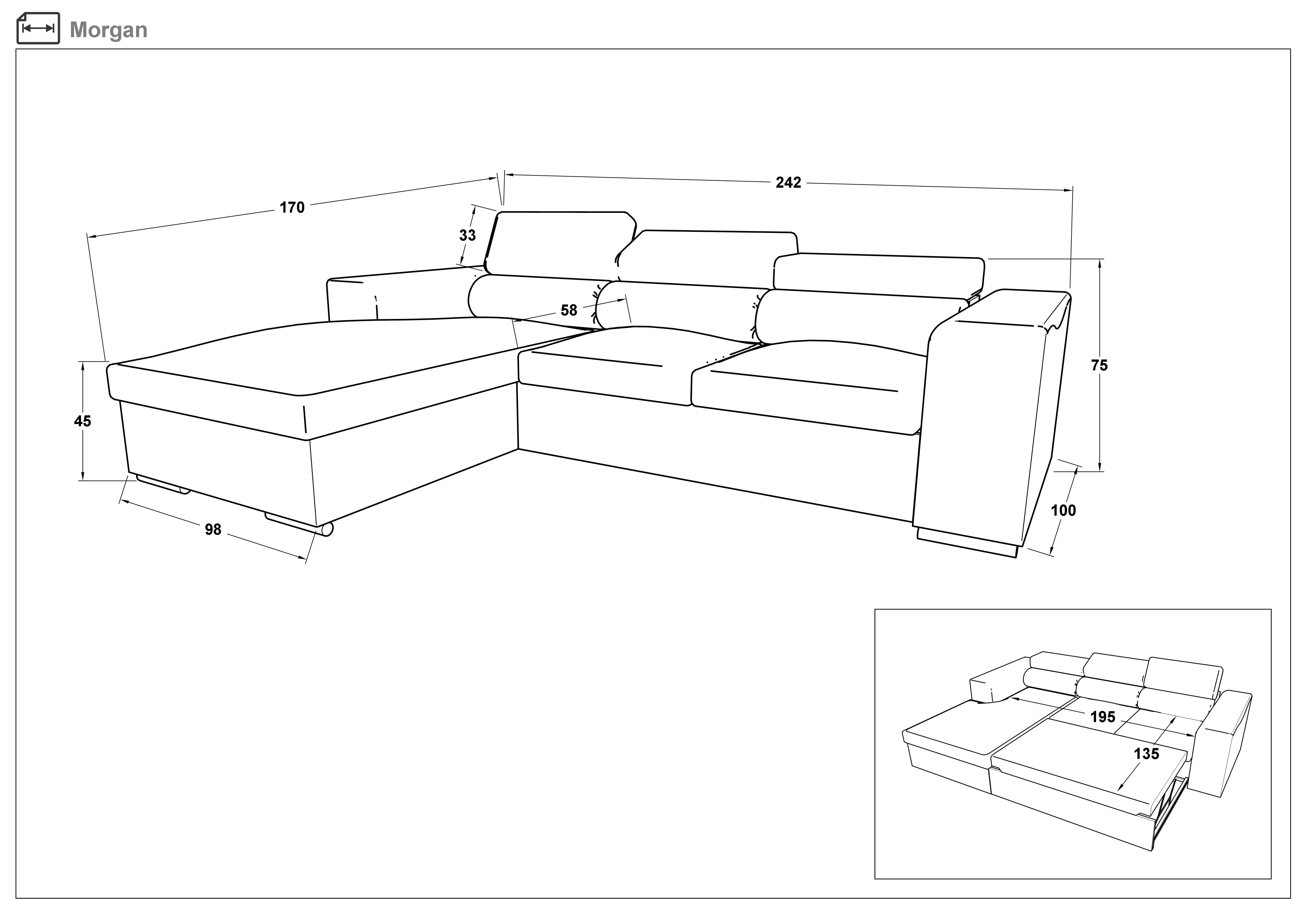 Asigurati-va confort de prima clasa si functionalitate impecabila cu coltarul extensibil Morgan.Formele sale elegante si materialul de inalta calitate ofera un aspect rafinat si la moda pentru orice tip de interior. Coltarul Morgan are un aspect care se potriveste atat cu confortul casei cat si cu mediul elegant de la birou. Cu acest coltar fiecare pauza va aduce placeri de neegalat. Coltarul este echipat cu tetiere in trepte , un mecanism practic pentru a il transforma in pat si lada mare de depozitare. Acestea transforma coltarul intr-o piesa de mobilier contemporana super-eficienta. Modelul este tapitat cu material textil de inalta calitate avand o densitate excelenta si placuta la atingere. Baza si umplutura cu material de inalta elasticitate cu o densitate corespunzatoare formeaza tapiteria care ofera confort unic.