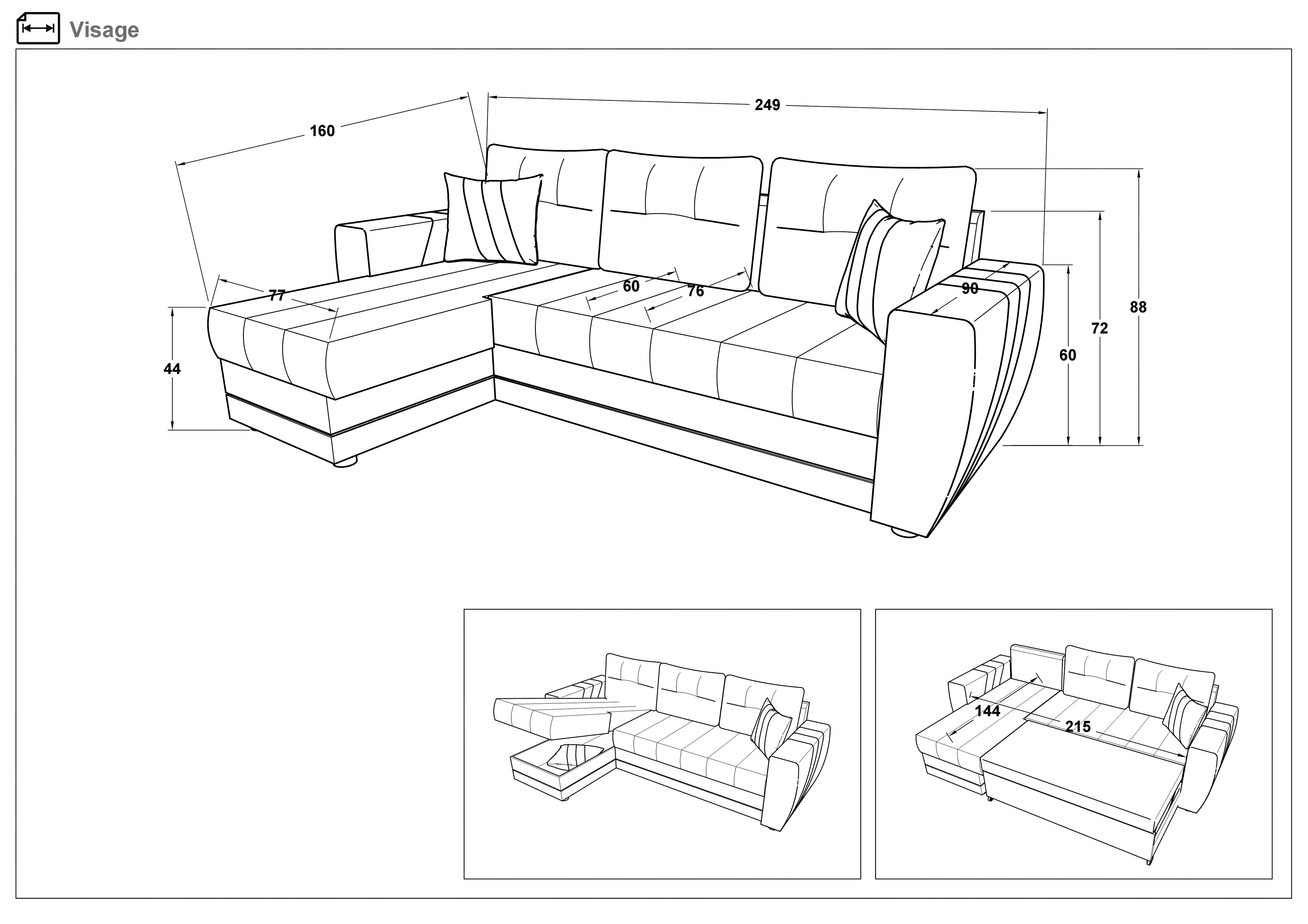 Visage ofera un sentiment de stil , armonie si confort exceptional. Coltarul este un model original care ofera utilitatea moderna si facilitate excelente. Are lada de depozitare si suprafata mare pentru dormit. Transformarea lui in pat este rapida si usoara. Coltarul este tapitat cu materiale de inalta calitate – piele ecologica si material textil. Materialele sunt de calitate inalta cu densitate buna si rezistenta excelenta la uzura. Nu se micsoreaza si nu se lasa. Materialul are o suprafata neteda catifelata care creeaza o senzatie de lux si confort. Umplutura din spuma groasa,cu elasticitate ridicata N2538 si vata ofera o baza elastica cu moliciune adecvata pentru confort zilnic fara cusur.
