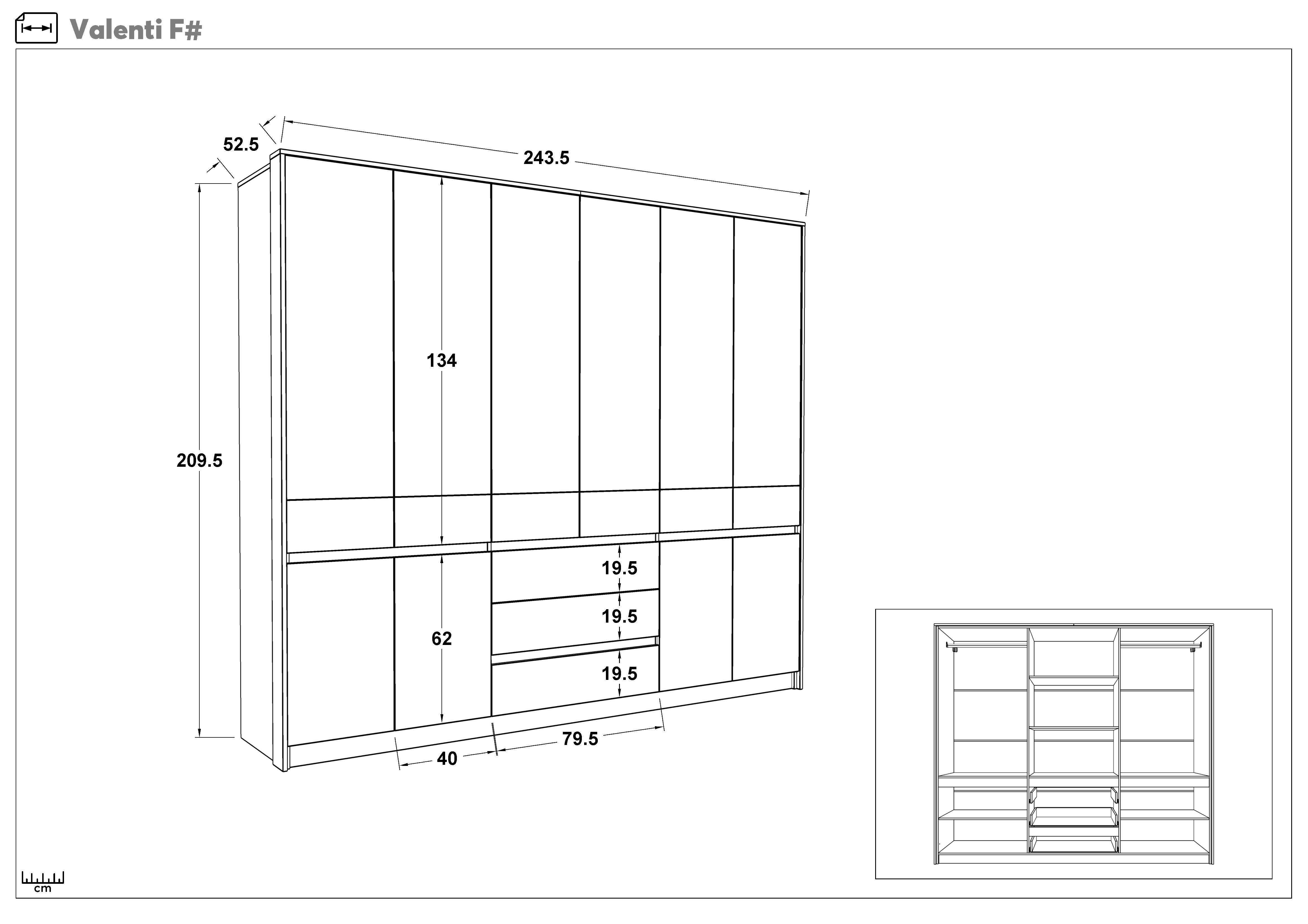 - Dulap cu sase usi cu 2 buc. bara pentru umerase si mai multe rafturi, precum si sertare.