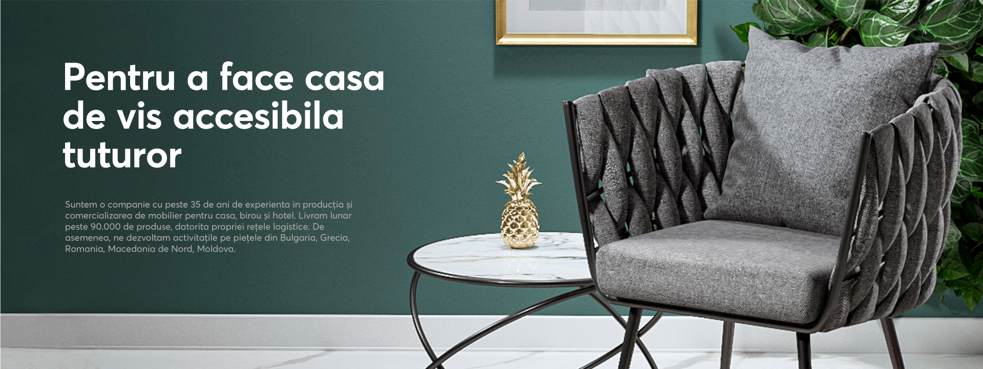 Suntem o companie cu peste 35 de ani de experienta in producția și comercializarea de mobilier pentru casa, birou și hotel. Livram lunar peste 90.000 de produse, datorita propriei rețele logistice. De asemenea, ne dezvoltam activitațile pe piețele din Bulgaria, Grecia, Romania, Macedonia de Nord, Moldova.