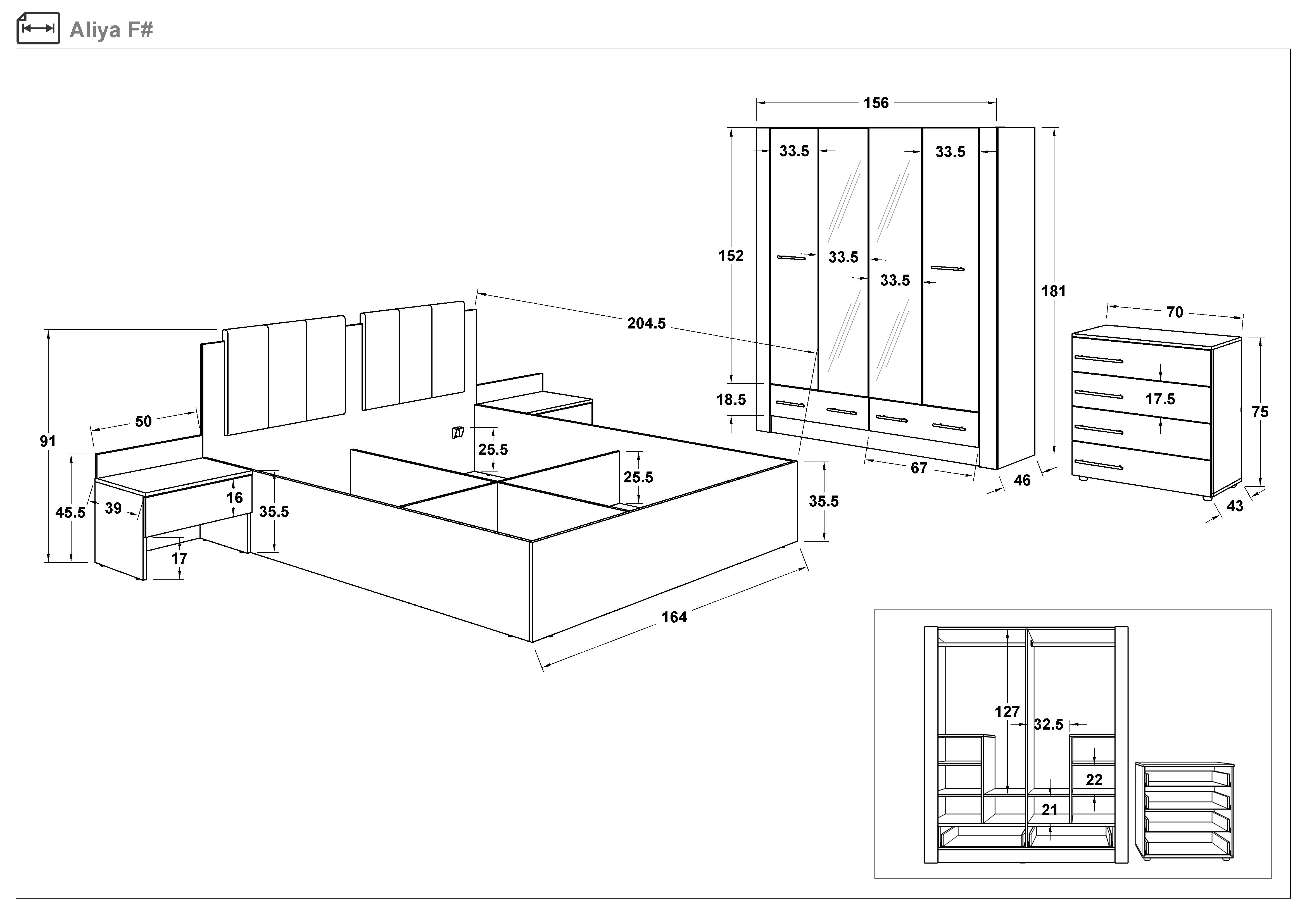 Setul include pat, saltea cu o fata Neo Dream, dulap, comoda cu sertare si noptiere (2buc.)