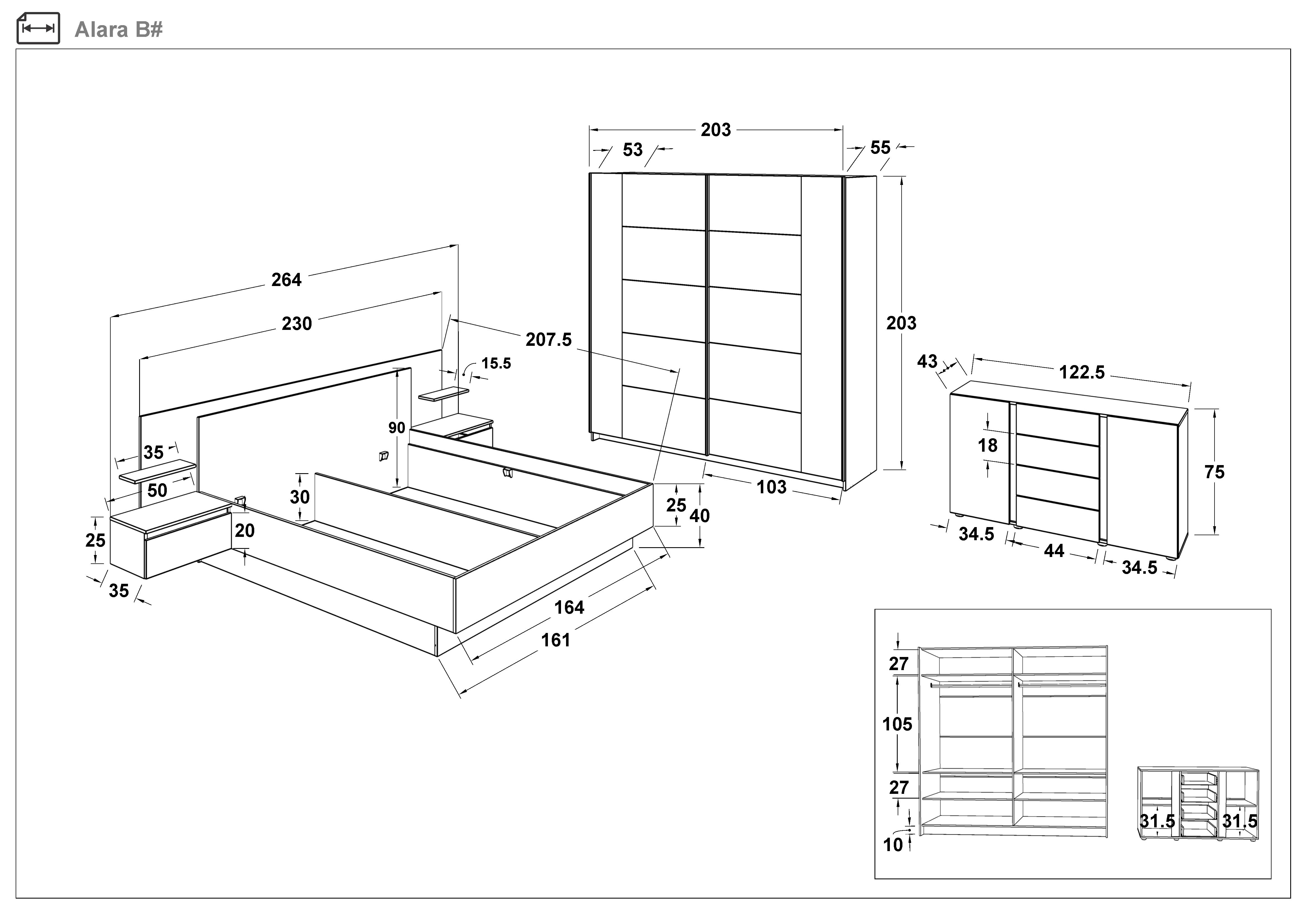 Setul include: pat, saltea cu o fata Neo Dream 160/200 cm, dulap, comoda, noptiere (2 buc.).